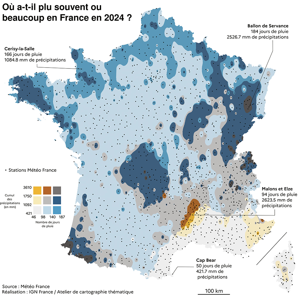 Sur la carte produite par l’atelier de cartographie thématique, on observe toutefois des disparités importantes entre les régions. Alors que les Pyrénées-Orientales et l’Aude sont les seuls départements à avoir connu un déficit de précipitations (50 jours de pluie et 421mm de précipitations seulement au cap Bear, voir sur la carte), l’extrême est et l’extrême ouest ont été copieusement arrosés. Le ballon de Servance, dans les Vosges, considéré comme le toit de la Haute-Saône (1.216m d’altitude) a ainsi enregistré 184 jours de pluie en 2024, soit plus d’un jour sur deux, et un total de 2.526mm de précipitations, c’est-à-dire bien 135% de plus qu’une moyenne nationale déjà élevée. Autre enseignement de cette carte, la violence des événements climatiques. À Malons et Elze, aux confins des Cévennes et de l’Ardèche, les 2.623mm de précipitations se sont abattus en seulement 94 jours, pour une moyenne de 27,8mm par jour de pluie.